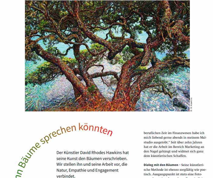 Die „Baum Charaktere” von David R. Hawkins traten in dieser einzigartigen Serie detailgenau und in leuchtenden Farben auf. Jedes der insgesamt 18 Baumportraits entfaltete sich wie eine eigene Persönlichkeit, mit feinsten Details, die von den tiefen Wurzeln bis zu den majestätischen Wipfeln reichen. Der Künstler verstand es meisterhaft, die Essenz der Bäume einzufangen und in seinen Werken zum Leben zu erwecken.